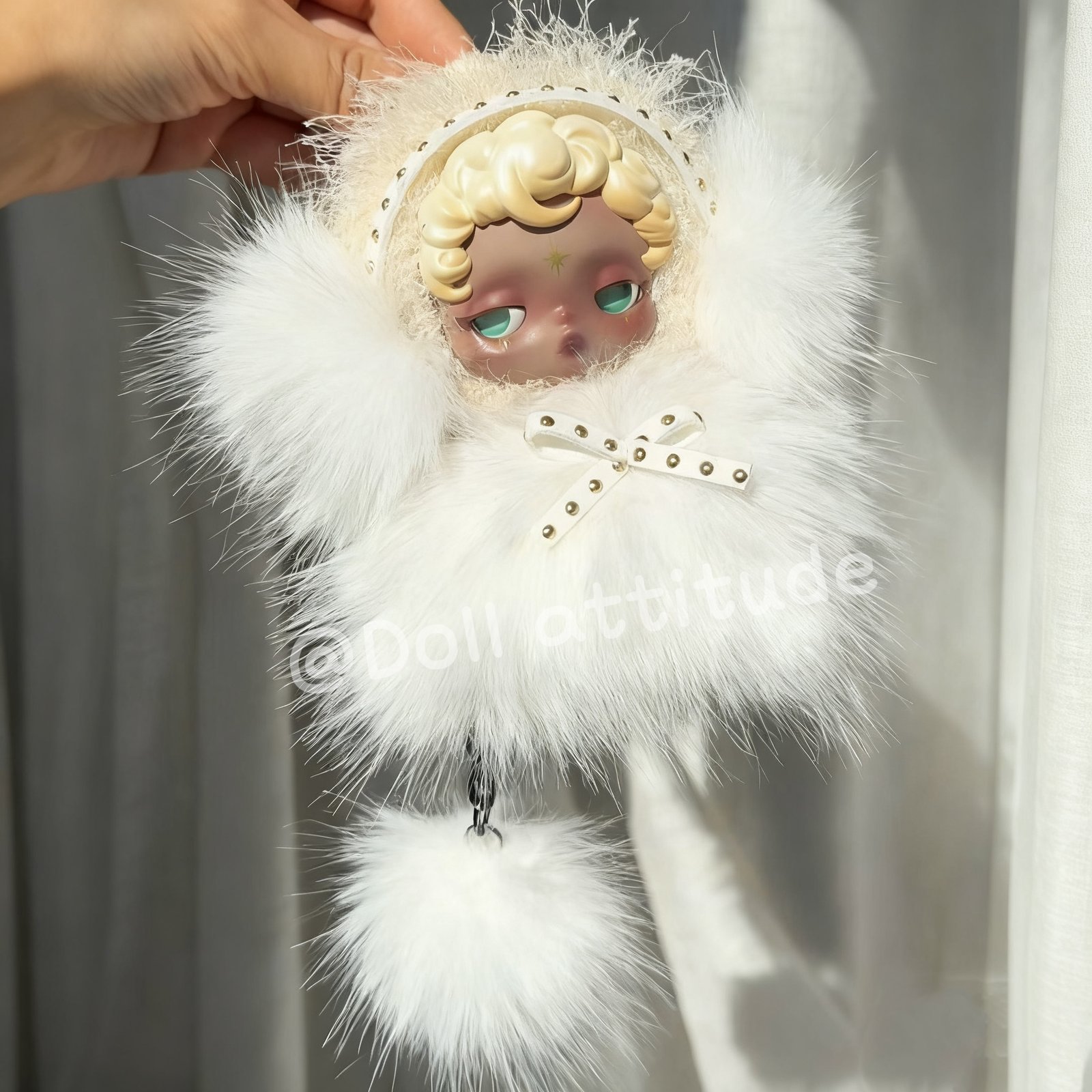 Detailed description: I absolutely adore this black doll. Her emerald-green eyes are like a pool of spring water, clear and mysterious. The first time I saw her, I felt she was like an angel, noble and beautiful. The angel wings on the original doll clothes are already beautiful, but they are a bit thin for the cold winter. Wearing this fluffy fur coat and fluffy little earmuffs, she instantly transforms into an Eskimo angel!